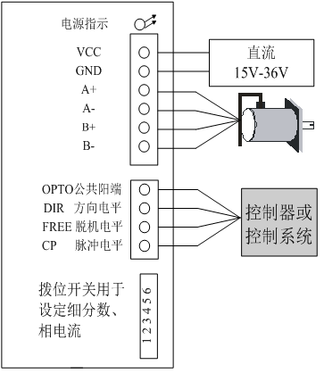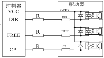 若VCC大于+5V,則使用到的CP、DIR、FREE端子分別外串接限流電阻R,保證給內(nèi)部光耦提供8~15mA的驅(qū)動(dòng)電流,參見(jiàn)表一