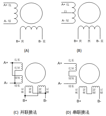 并聯(lián)接法:紅長(zhǎng)聯(lián)綠短接至A+,紅短聯(lián)綠長(zhǎng)接至A-,黃長(zhǎng)聯(lián)藍(lán)短接至B+,黃短聯(lián)藍(lán)長(zhǎng)接至B-(如圖二C)。